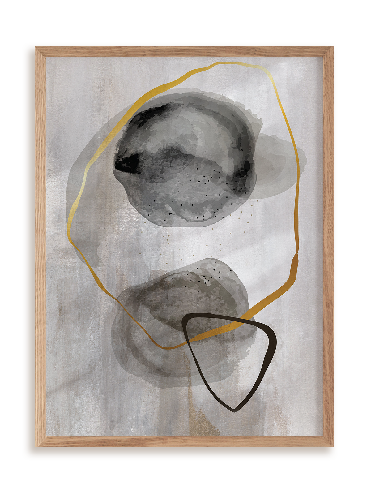 Plakat jest oprawiony w ramkę drewnianą o prostym, eleganckim profilu.