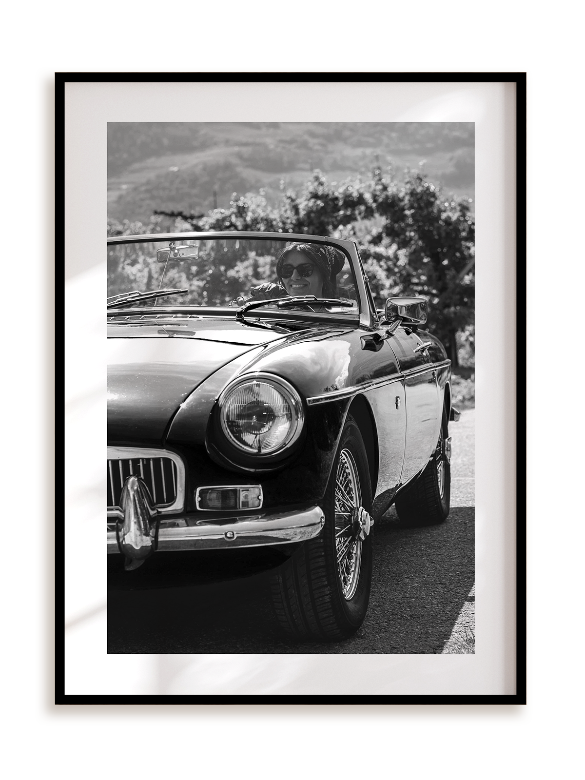 Plakat jest oprawiony w ramkę metalową o prostym, eleganckim profilu.
