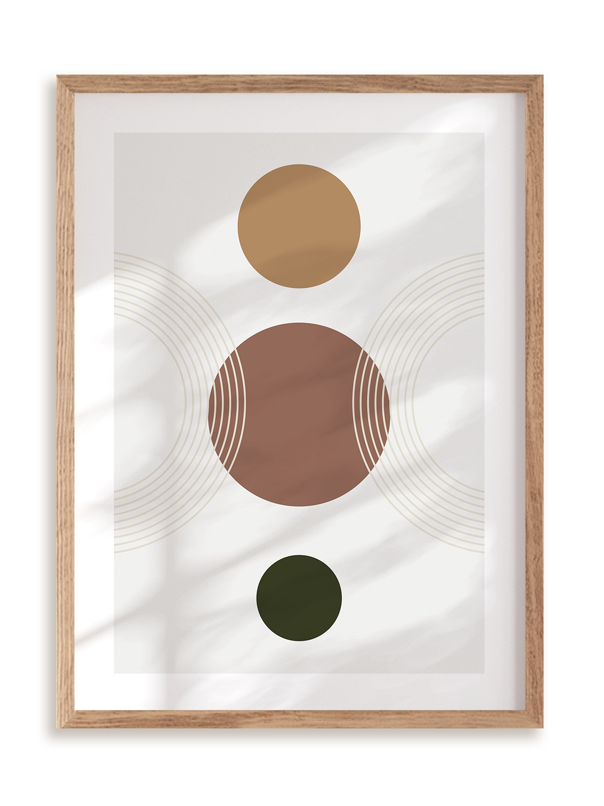 Plakat jest oprawiony w ramkę drewnianą o prostym, eleganckim profilu.