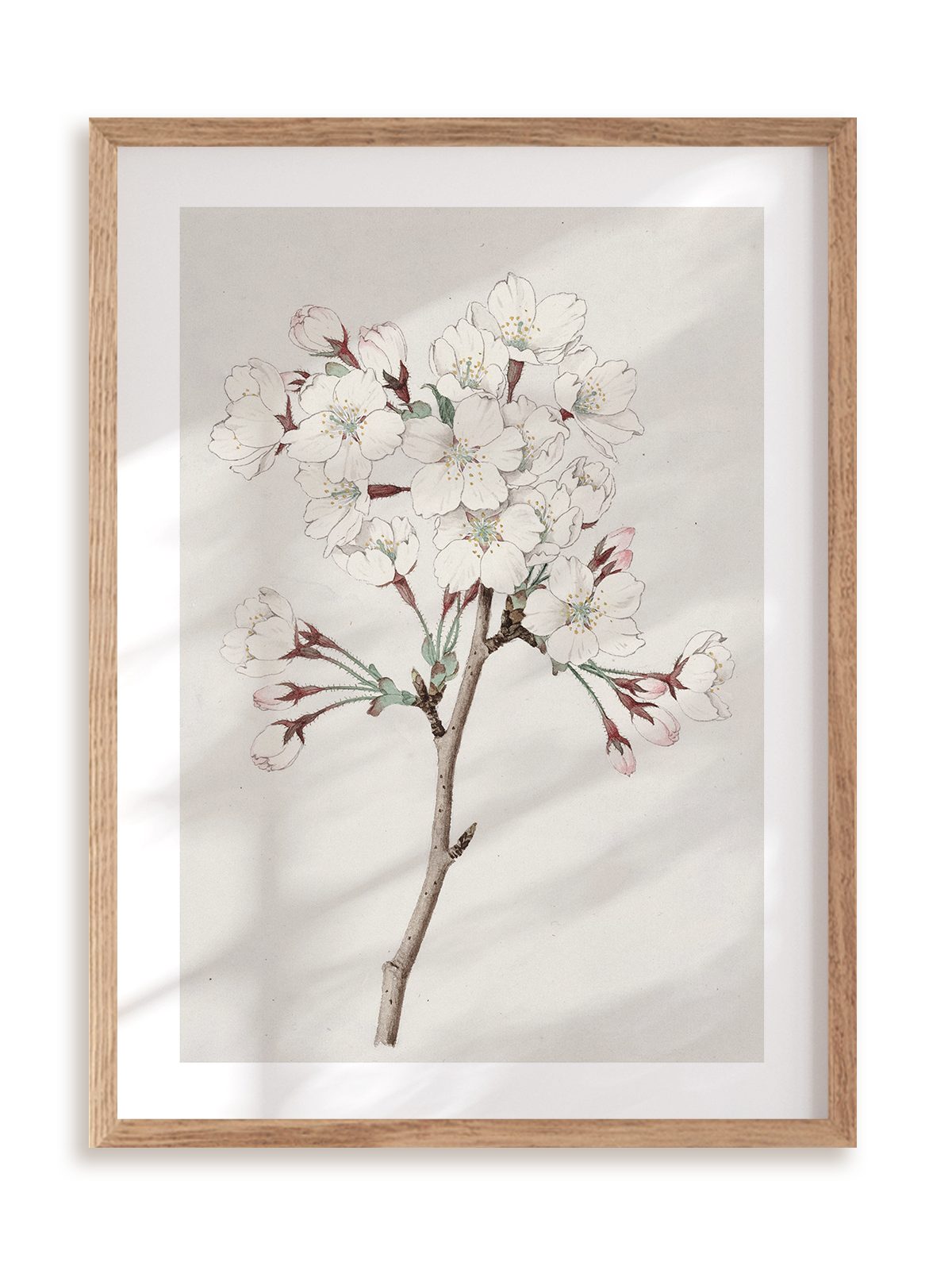 Plakat jest oprawiony w ramkę drewnianą o prostym, eleganckim profilu.