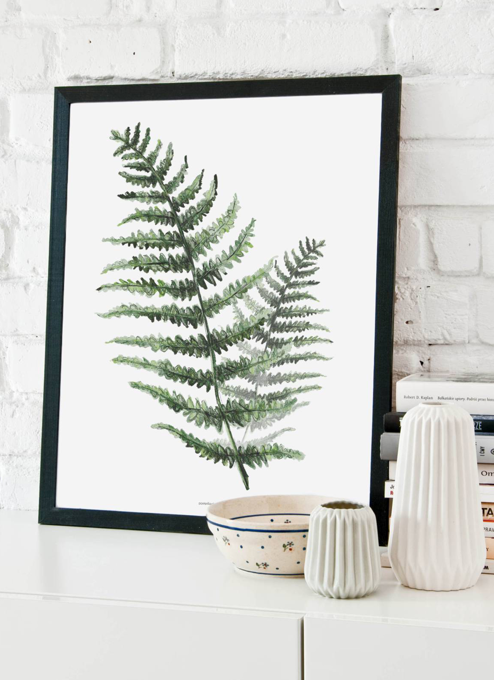 Plakat przedstawiający gałązkę paproci w zielonym kolorze.