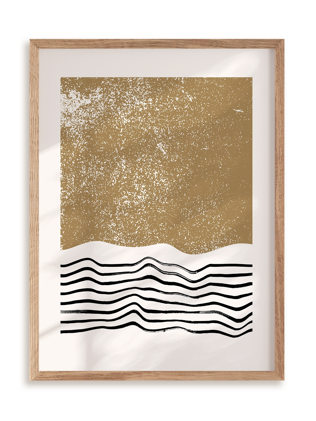 Plakat jest oprawiony w ramkę drewnianą o prostym, eleganckim profilu.