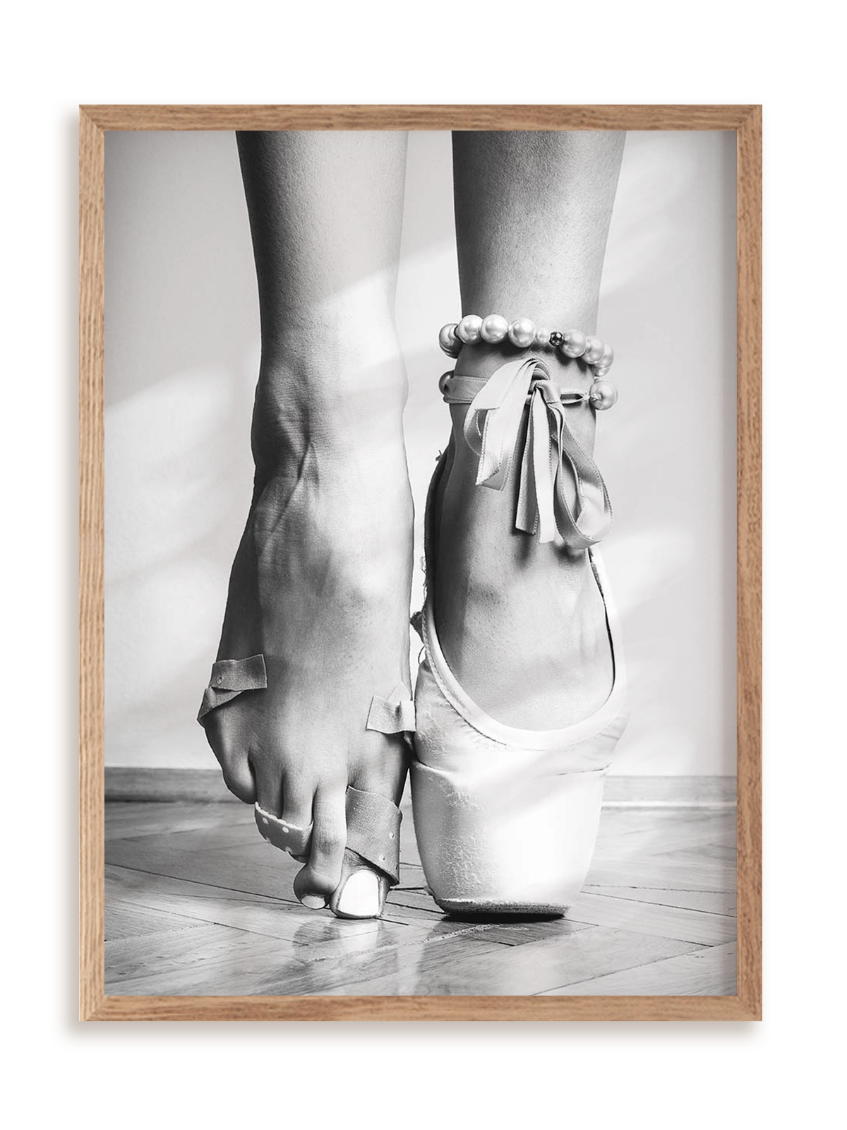 Plakat jest oprawiony w ramkę drewnianą o prostym, eleganckim profilu.