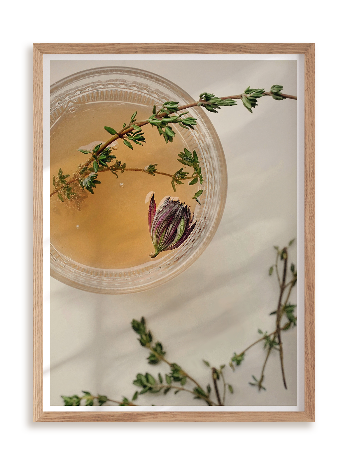 Plakat jest oprawiony w ramkę drewnianą o prostym, eleganckim profilu.