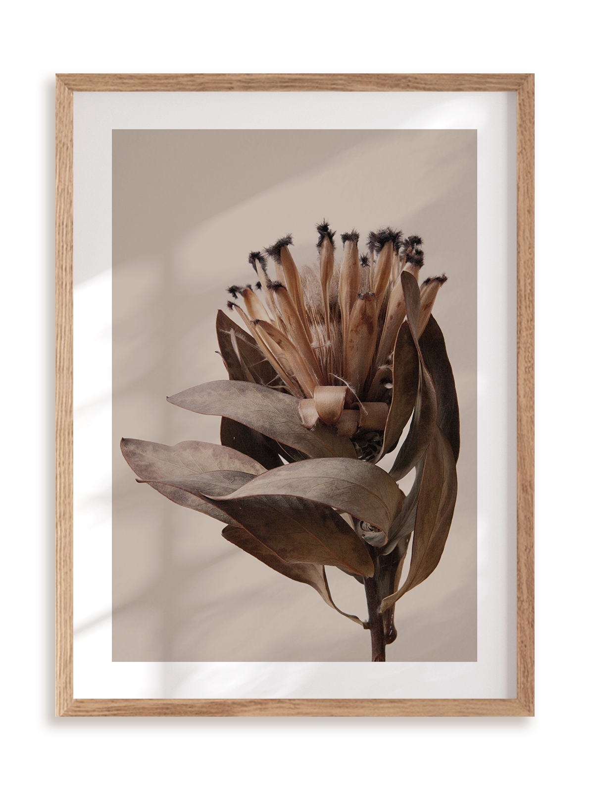 Plakat jest oprawiony w ramkę drewnianą o prostym, eleganckim profilu.