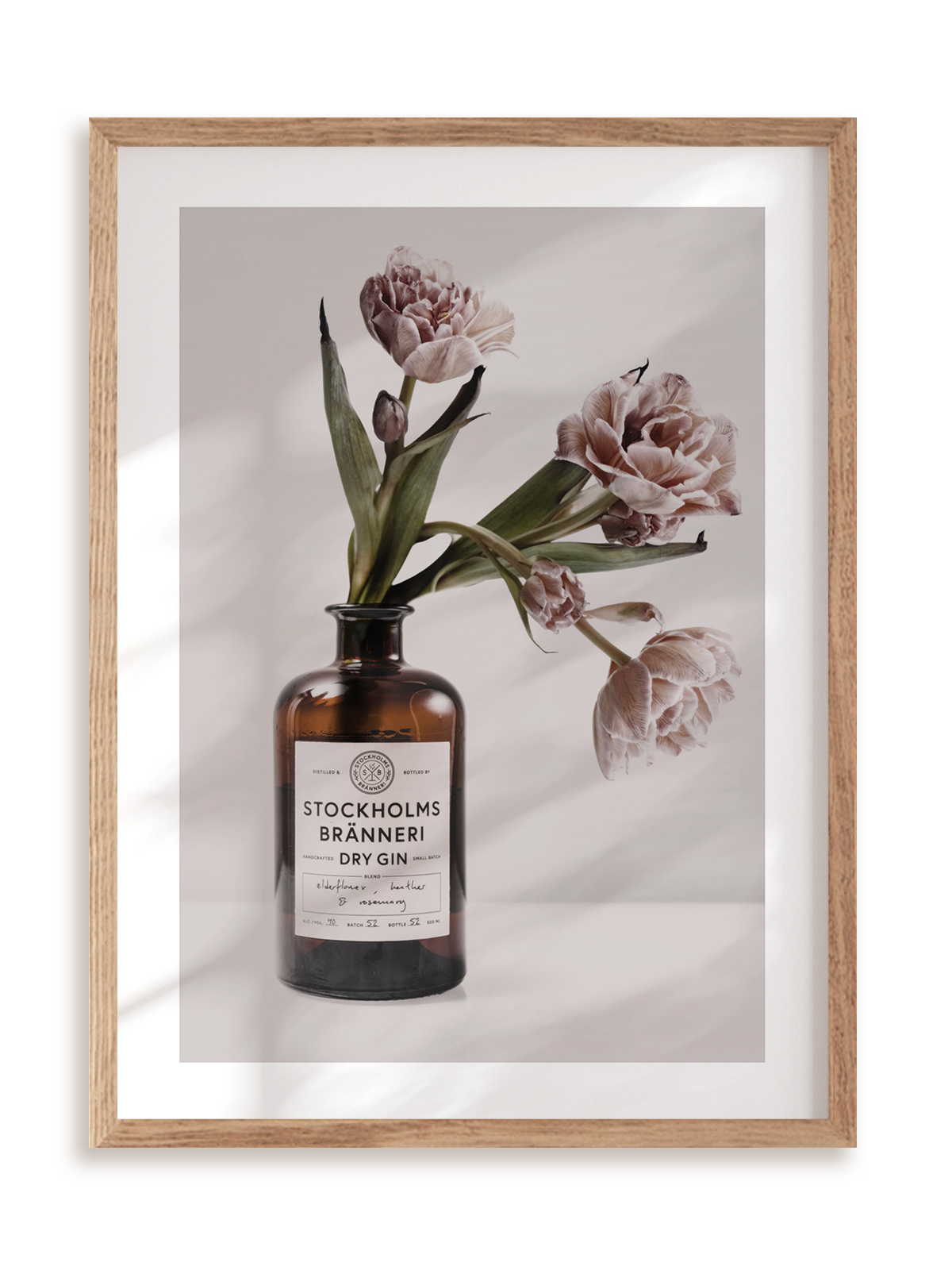 Plakat jest oprawiony w ramkę drewnianą o prostym, eleganckim profilu.