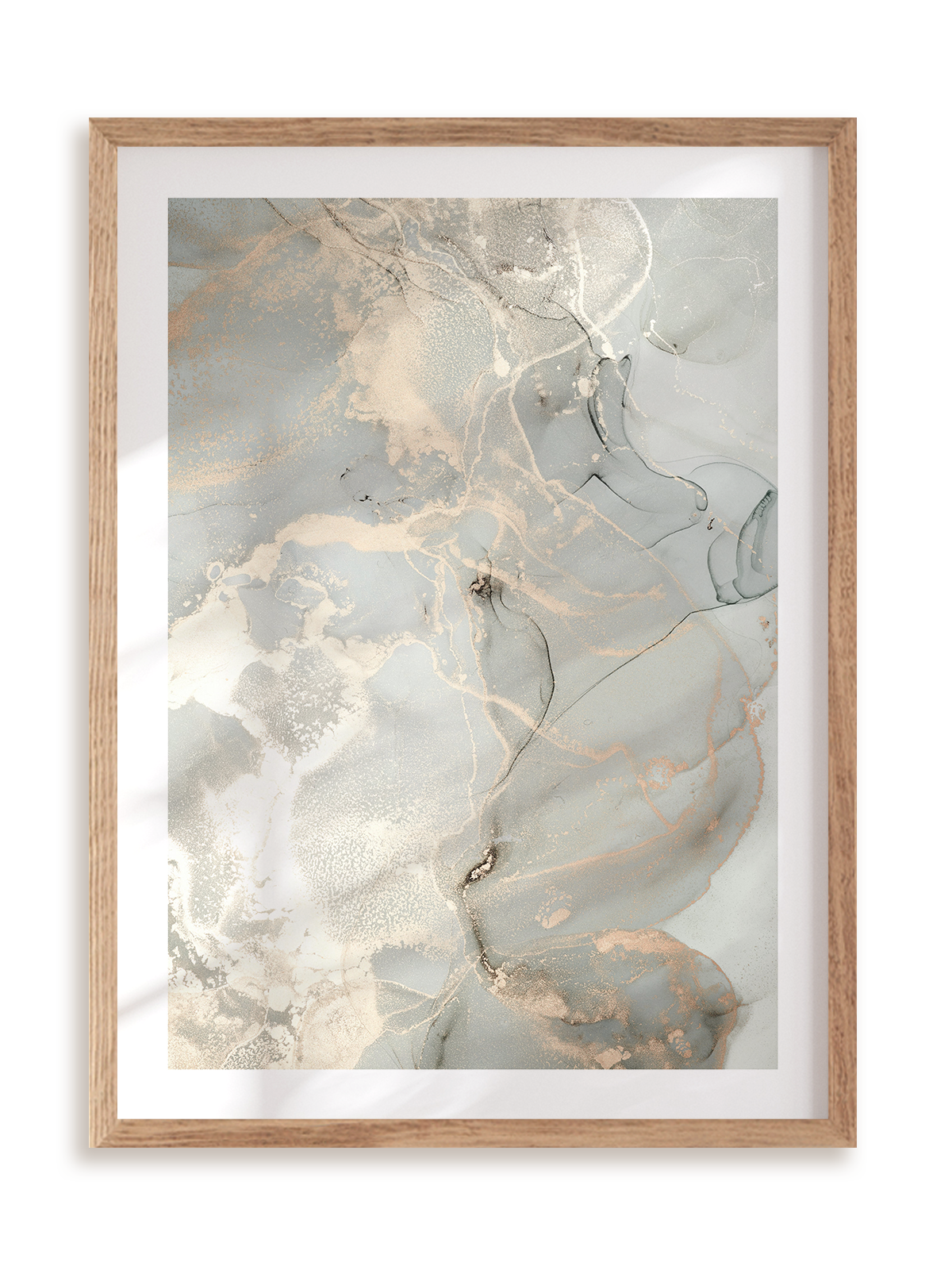 Plakat jest oprawiony w ramkę drewnianą o prostym, eleganckim profilu.
