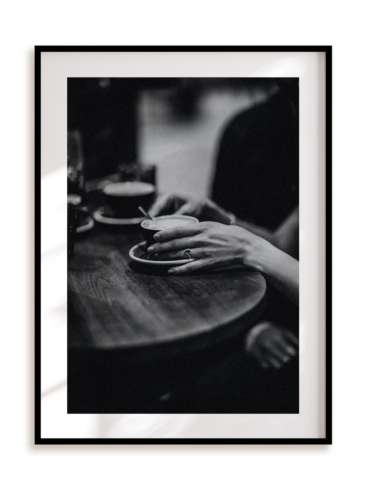 Plakat jest oprawiony w ramkę metalową o prostym, eleganckim profilu.