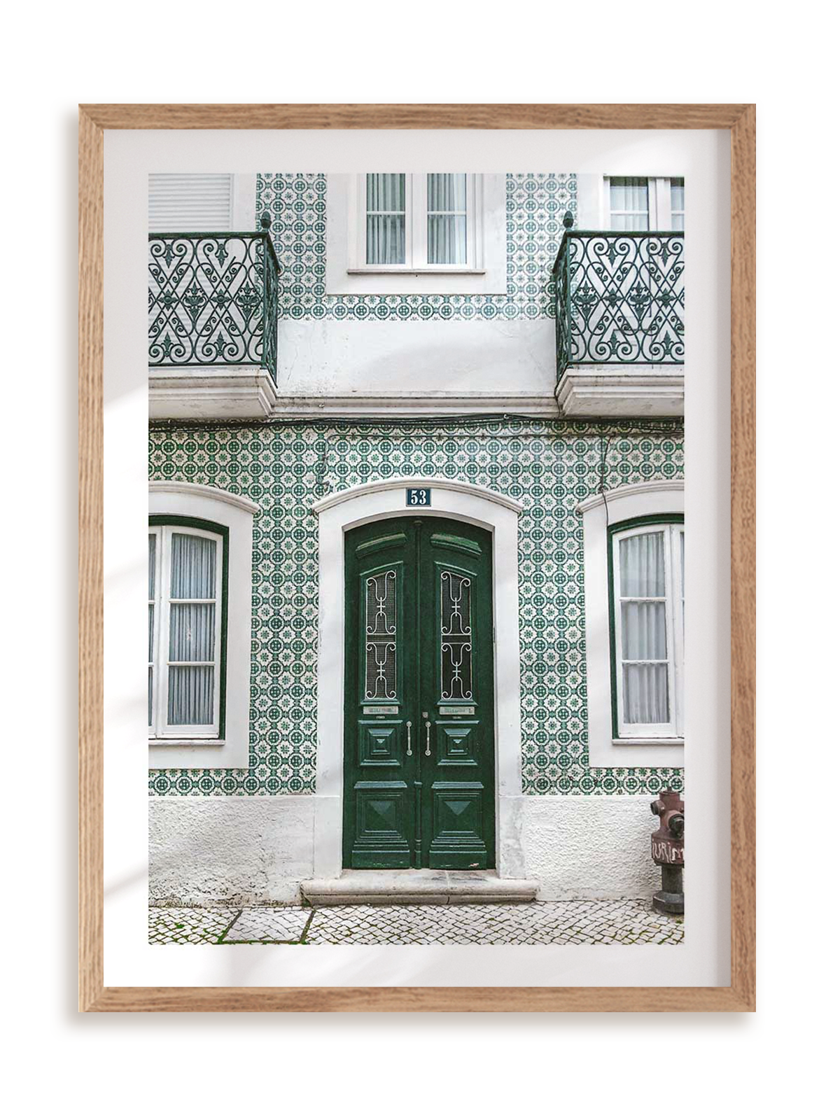 Plakat jest oprawiony w ramkę drewnianą o prostym, eleganckim profilu.